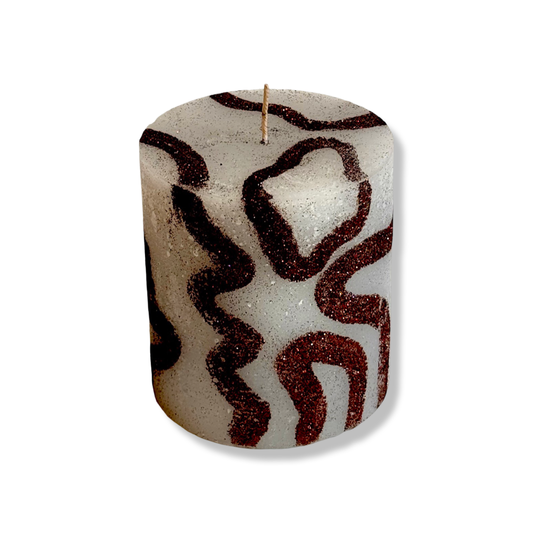 Het glitter patroon wordt er met de hand opgemaakt. Hierdoor is elke kaars uniek en kan deze iets afwijken van de foto.