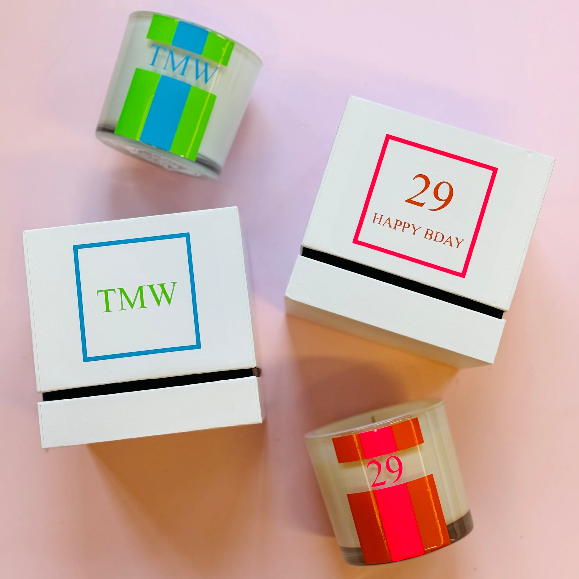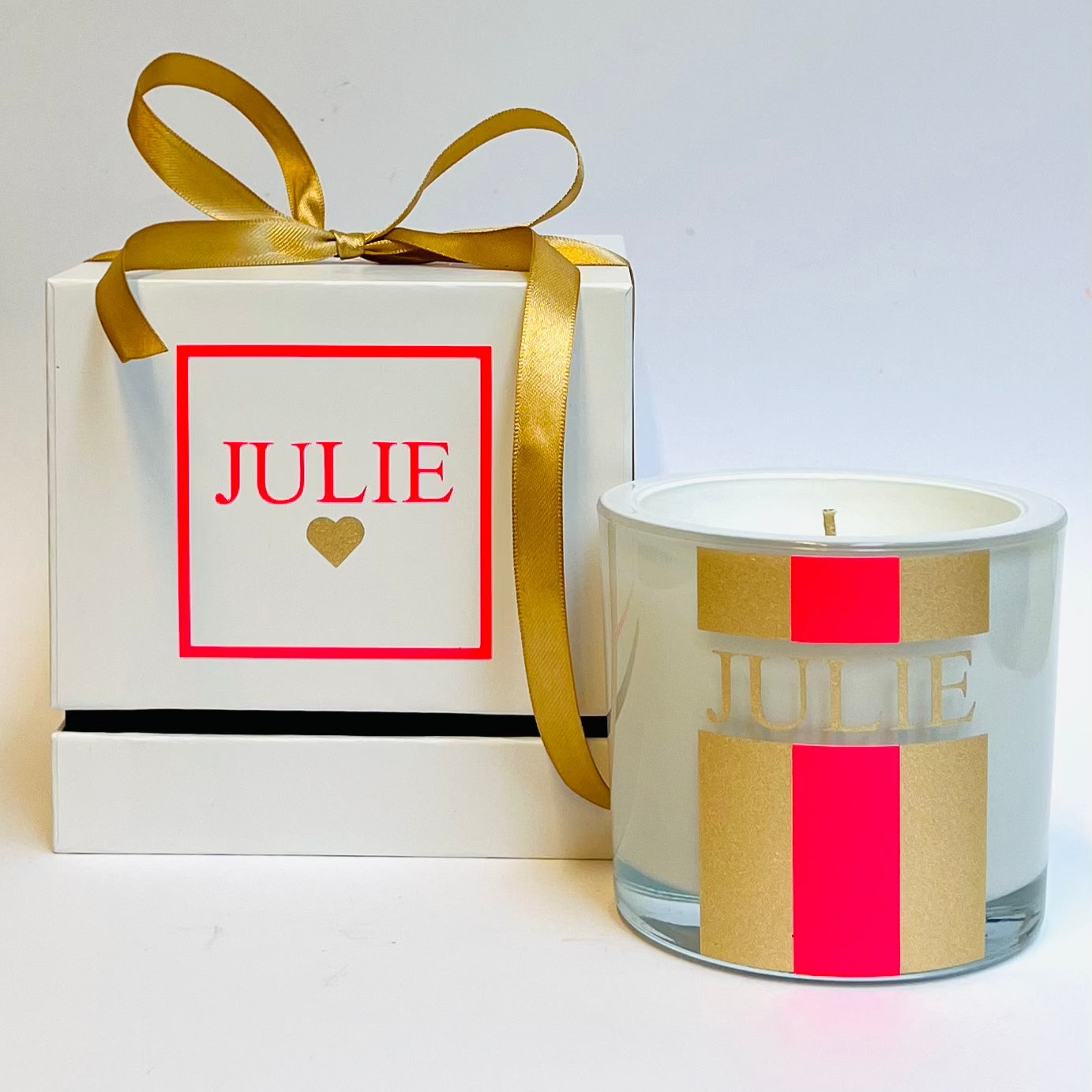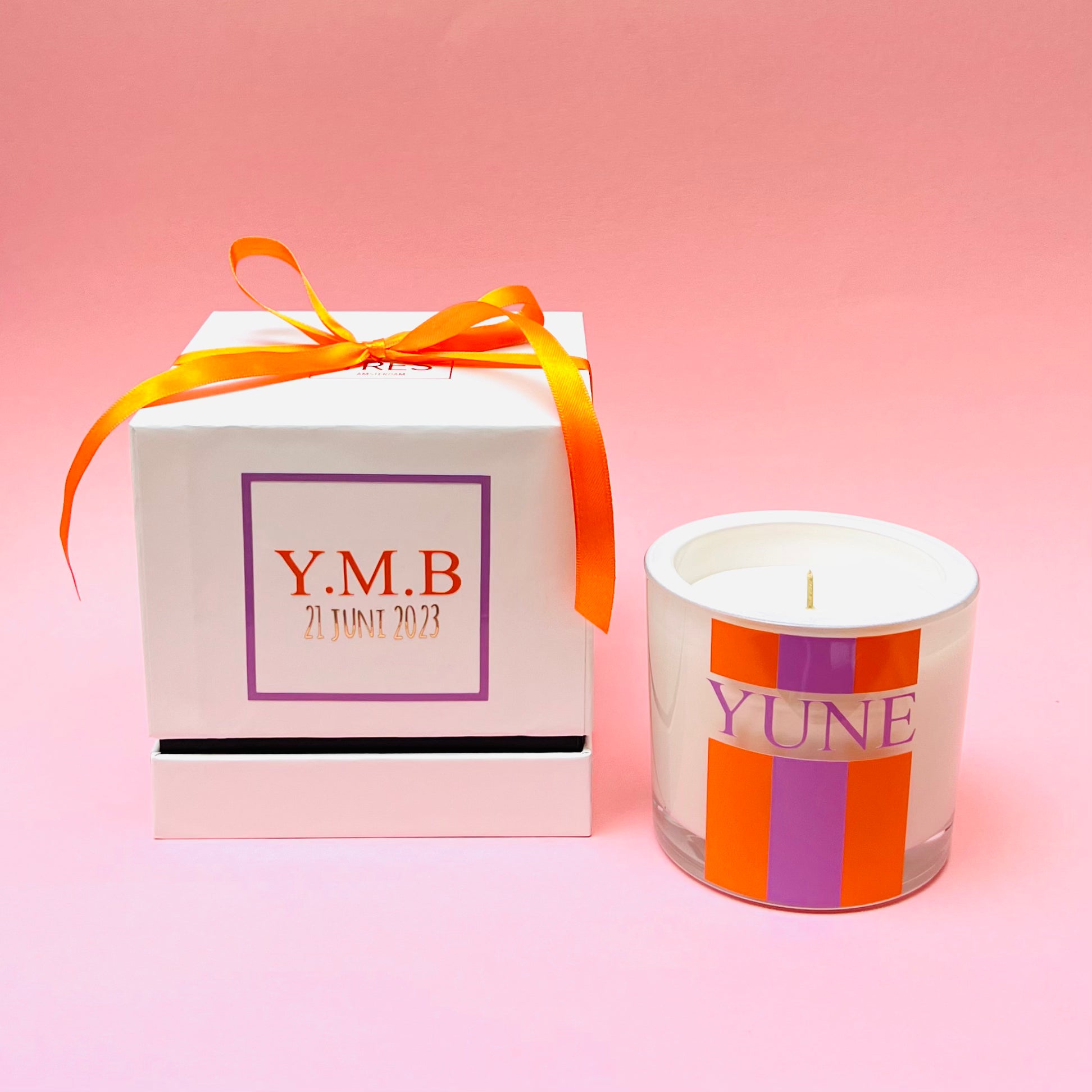 De kaars komt in een luxe doos die ook gepersonaliseerd wordt.