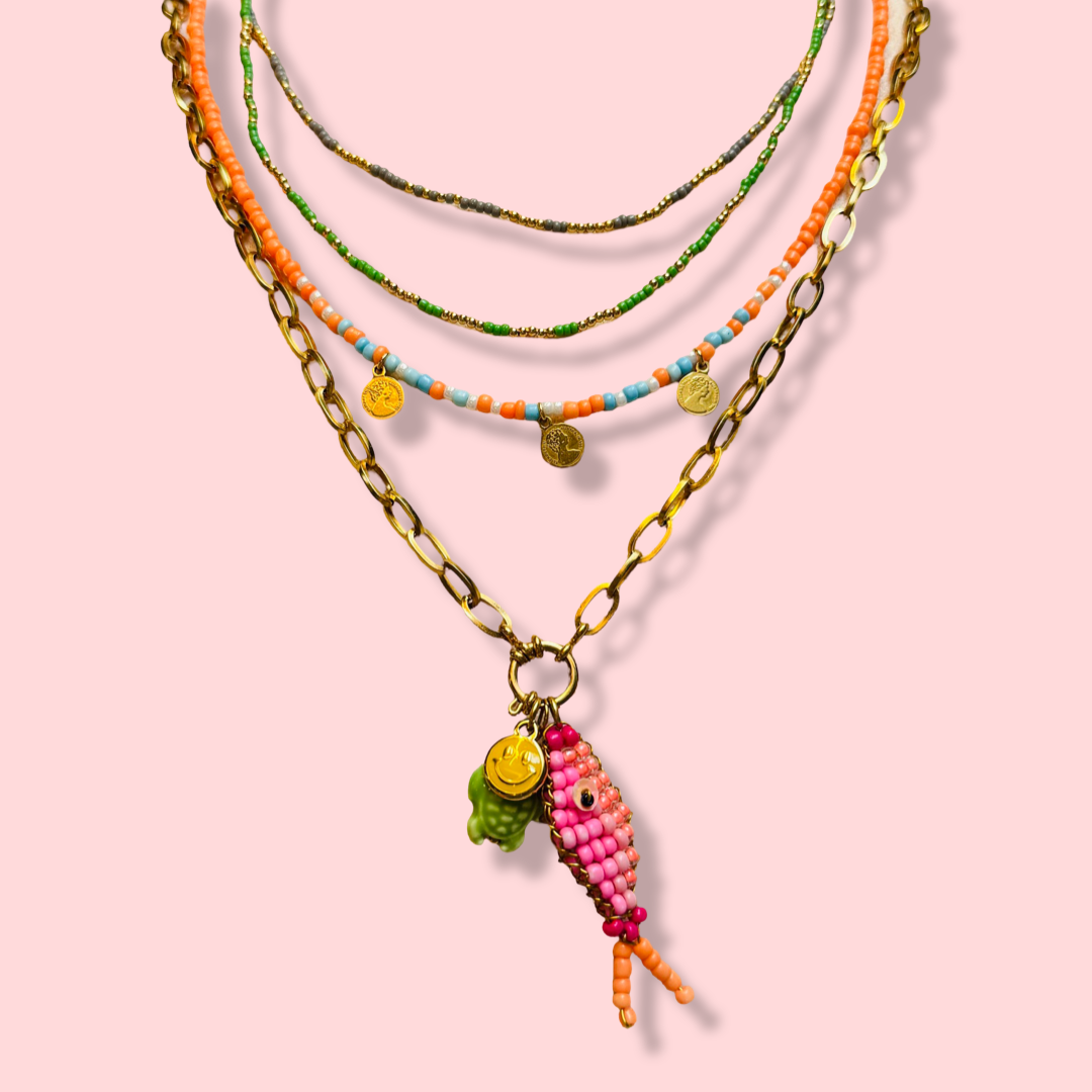 Dit vrolijke kettinkje met kralen vis hanger is perfect om jouw zomer outfit helemaal af te stylen! Kies zelf jouw favorieten kleur visje. Of geef een kleuren suggestie, dan maken wij de bedel in jouw eigen unieke kleuren combinatie.